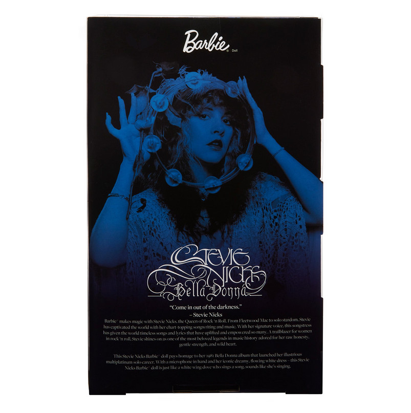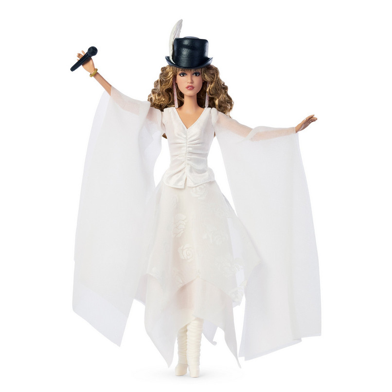 От фронтменки Fleetwood Mac до звезды сольного творчества, Стиви Никс десятилетиями была музыкальной иконой и образцом свободного стиля. Наш второй трибьют-образ Барби этой королеве рока вдохновлён её образом для обложки альбома Белла Донна, её первого сольного выступления. Она выходит на сцену в струящемся белом платье с лифом с рюшами, эффектными прозрачными рукавами и асимметричным подолом. Добавьте к этому её фирменный цилиндр, высокие белые сапоги и микрофон, и она готова выступать перед толпами восторженных поклонников.
