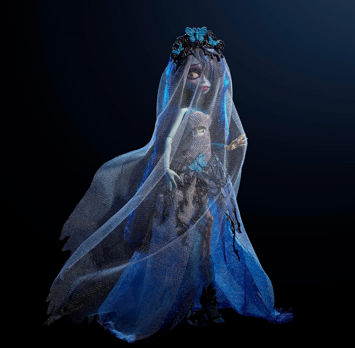 Эмили одета в готическое свадебное платье, ее сердце наверняка захватило бы дух, если бы оно у неё было! Платье выполнено из тонкой ткани, имитирующей паутину, которая струится по синему тюлю, а полупрозрачная вуаль с бабочками, дополняет её неземной образ. 11 точек артикуляции и уникальная скульптура тела. Эмили в чёрных, как ночь, расшитых бисером туфлях, на одном каблуке которых изображено дерево, а на другом — собака Скрэпс.