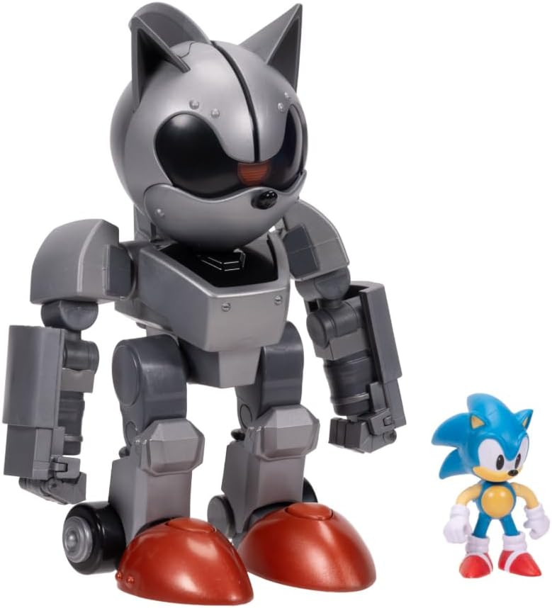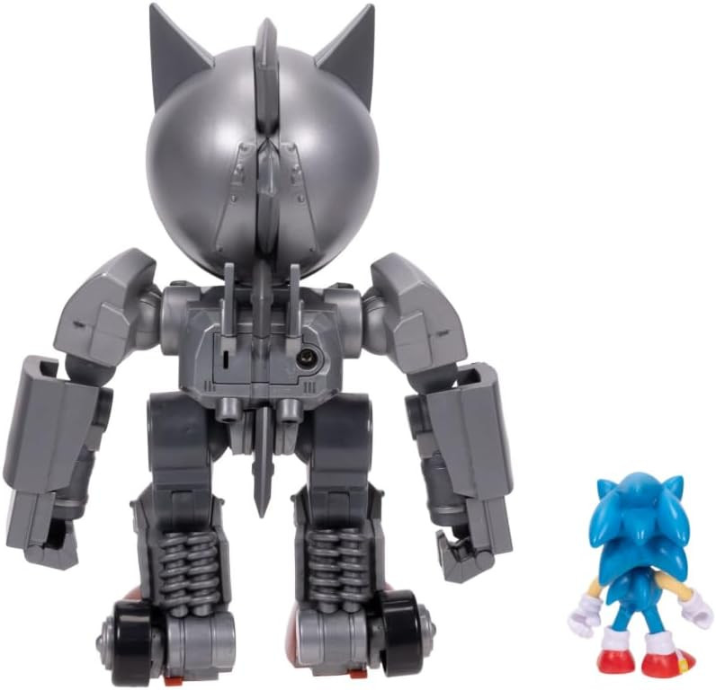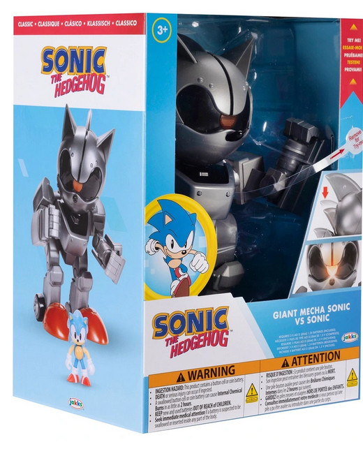 Гигантский Меха Соник высотой 20 см имеет 16 точек артикуляции для динамичных поз, а его глаза и реактивный ранец светятся (требуются 3 батарейки LR44, входят в комплект). В подошвах его ног встроены колесики.